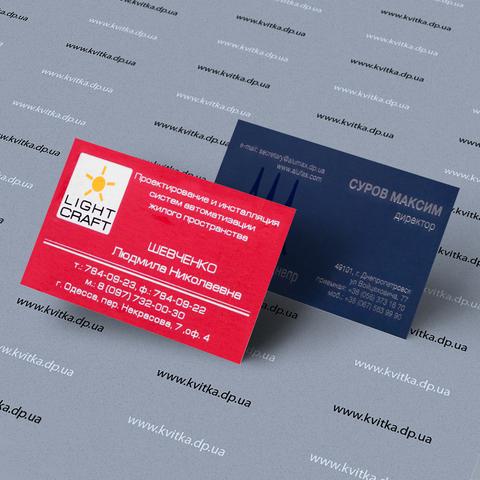 Візитки тиснення, два кольори, з одного боку 2+0 – ціна за комплект 100 шт. Щоб замовити, виберіть кількість комплектів.